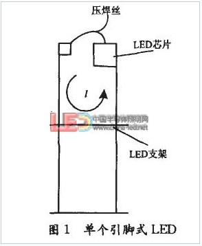 在LED引腳式封裝過程中,每個LED芯片是被固定在引線支架上的,LED芯片通過壓焊金絲(鋁絲)與引線支架形成了閉合回路,如圖1。若忽略引線支架電阻,LED支架回路光電流等于芯片光生電流IL。可見,當p-n結材料和摻雜濃度一定時,支架回路光電流與光照強度I成正比。