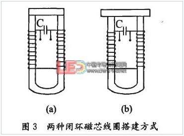 在磁芯材料確定的情況下,為了得到較大磁感應強度B,需改變線圈中磁芯的結構。若磁芯結構設計為環形,由式(8)知,磁感應強度B增大倍數理論上與磁芯的相對磁導率盧,大小相等,檢測信號幅值將達到最大。與條形磁芯同種材質的u型磁芯上搭接一塊條形磁芯就構成環形磁芯線圈,其搭接方式有兩種,如圖3示。
