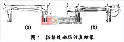 檢測時將繞有線圈的U型磁芯的一端插入圖1所示1閉合回路,感應LED支架回路中回路電流產生的交變磁通,再將條形磁芯搭接在U型磁芯上,使感應磁路閉合。由于搭接方式不同,兩種搭接方式的磁芯線圈處在支架回路所產生的交變磁場中時,其搭接處磁路也將不同,用AnsoftMaxwell軟件仿真兩種搭接方式的磁芯搭接處在交變磁場中的磁回路,結果如圖4示