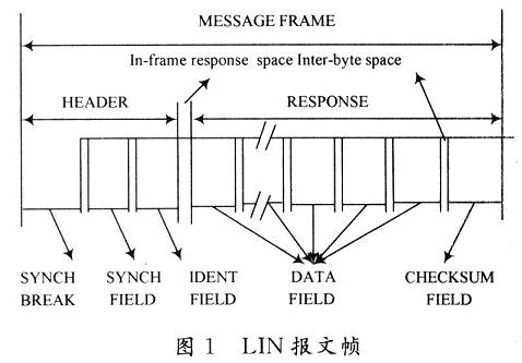 報(bào)文幀的報(bào)文頭包括一個(gè)同步間隔場(chǎng)(SYNCHBREAKFIELD)、一個(gè)同步場(chǎng)(SYNCHFIELD)和一個(gè)標(biāo)識(shí)符場(chǎng)(IDENTITYFIELD)。報(bào)文幀的響應(yīng)(RESPONSE)則由3~9個(gè)字節(jié)場(chǎng)組成:2,4或8字節(jié)的數(shù)據(jù)場(chǎng)(DATAFIELD)和1個(gè)字節(jié)的校驗(yàn)和場(chǎng)(CHECKSUMFIELD)。字節(jié)場(chǎng)由字節(jié)間空間分隔,報(bào)文幀的報(bào)文頭和響應(yīng)是由一個(gè)幀內(nèi)響應(yīng)空間分隔。最小的字節(jié)間空間和幀內(nèi)響應(yīng)空間是0。