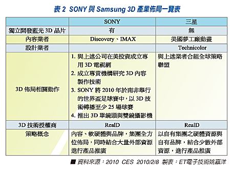 然而,消費(fèi)者要的不是一臺(tái)高科技電視,更要豐富的閱聽內(nèi)容。以3D影像產(chǎn)業(yè)而言,除了需要強(qiáng)大硬體裝置支援外,其豐富的3D內(nèi)容支援也是相當(dāng)重要的。09年的CES展,許多大廠開始拉攏平臺(tái)與內(nèi)容業(yè)者一同站臺(tái),因?yàn)樗麄冎拦馐侵挥杏搀w不能讓消費(fèi)者買單,多元的加值服務(wù)才是消費(fèi)性電子未來的趨勢。2010年的CES展,同樣也是依循前年的模式,而且力道更加強(qiáng)勁,以補(bǔ)強(qiáng)各自提出自有的硬體解決方案。另一方面,以SONY與三星來說,兩家公司同時(shí)都與RealD技術(shù)合作以獲取3D的專利技術(shù),以避免專利侵權(quán)的問題發(fā)生,就以產(chǎn)業(yè)現(xiàn)況來看,頗有烘抬3D產(chǎn)業(yè)的味道(見表二)。