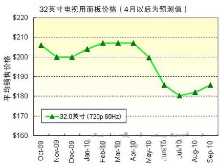 • 預計2010年第三季度32英寸用面板價格為180~185美元左右