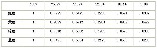 得到了在100%,75.9%,51.2%,22.8%,10.1%,5.9%霧濃度下,四種單色LED的透過率。取三次重復實驗的平均值,如表2所示。