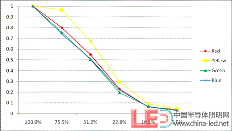 • 在任意濃度下,黃色LED的透過率最大,其次是紅色LED