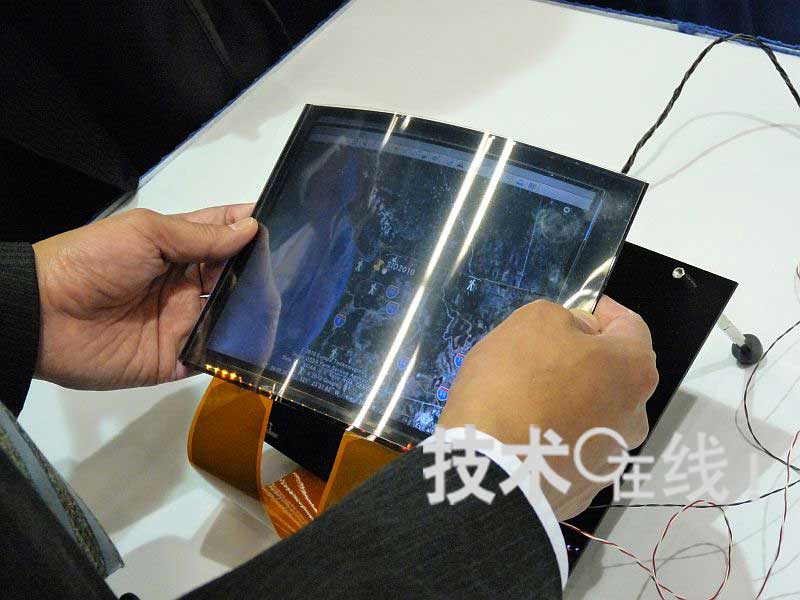 東芝開發出了可通過彎曲顯示器來放大或縮小顯示圖像的柔性液晶面板,并在全球最大的顯示器國際會議“SID 2010”上進行了發布(論文編號:54.4L)。在AUTHOR INTERVIEWS上,東芝向觀眾演示了通過實際彎曲液晶面板,來放大或縮小畫面上顯示的“Google Earth”航攝照片。這種利用柔性顯示器特點的直觀操作,吸引了許多技術人員的關注。