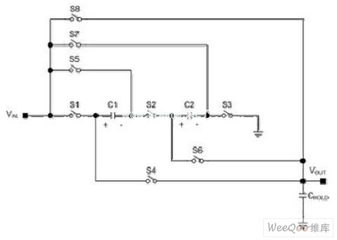 [page]輸出電容CHOLD提供輸出負載電流。隨著這個電容的放電,輸出電壓降低到期望的輸出電壓以下,第二個階段是被激活來將輸出電壓增高到這個值以上。在第二階段,C1和C2并聯,連接在VIN和VOUT之間。開關S4到S7關閉,而S1到S3和S8打開。因為電容兩端的電壓降并不能突變,輸出電壓跳變到輸入電壓值的1.5倍︰
