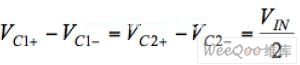 同樣的,電壓轉換在兩個階段內完成。在第一個階段,開關S1到S3關閉,而開關S4到S8打開。因此C1和C2并聯,假設C1等于C2,則充電到一半的輸入電壓︰