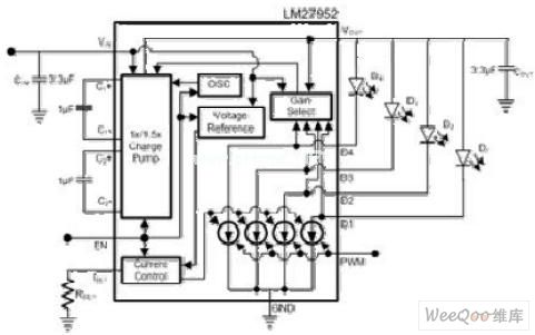 圖5:這個開關電容器白光LED驅動器可用于四個LED