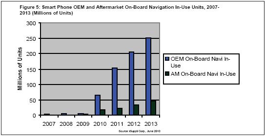 iSuppli公司預測,隨著智能手機在未來10年成為戰略性計算平臺,2010年基于智能手機的OEM和售后市場on-board導航系統使用量預計增長九倍,2014年有望增長到近40倍。