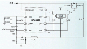 一個以諧振推挽拓撲控制壓電變壓器的電路如圖5所示。這個拓撲使用了兩個標準電感(L1和L2),通過UCC3977控制器和MOSFETS1和S2,這兩個電感在50%的占空比產生180度的相移。這個推挽電路優點是可以提供從直流輸入電壓到壓電變壓器初級的電壓增益,并通過這兩個電感和PZT初級電容之間的LC關系實現諧振。