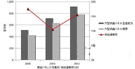 液晶面板的供求關系在2009年春季至2010年中期的1年多時間里,一直處于“供不應求”及“供需平衡”狀態。但DisplaySearch預計,到2012年中國本土及外資企業的大量生產線“開始量產”時,整個FPD產業將“陷入供給過剩局面”。