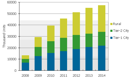 - 中國平面電視的出貨量將在2014年長至5千9百萬臺,年復合成長率為14%