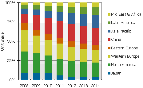 圖一 2008年到2014年中國液晶電視在不同區(qū)域的發(fā)展狀況