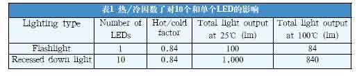 乍一看,16%的LED光通減少量影響可能不大。然而,當考慮到一個照明裝置由多個LED組成時,這個問題就嚴重了。用10個LED組成的嵌筒燈同一個LED組成的手電筒比較,熱/冷因數的影響就顯現出來了。