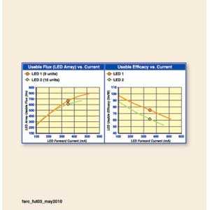由于LED1的高熱/冷因數,9個LED1的總光輸出比10個LED2高出50lm。盡管在25℃時,LED1的額定光通低于LED2,但在350mA的電流驅動下,其性能要超過LED2。圖3(左)顯示了LED1在任何前向電流的驅動下,都比LED2高出100mA。圖3(右)顯示了在同樣的電流驅動下,LED1的效能要高過LED2。