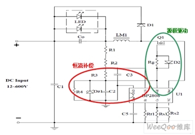 采用源極驅動,可以有效減少驅動電路電流消耗、降低功耗、提高效率;傳統的高壓差供電通路中為了將整流后的直流高壓降至PWM芯片所需要的低壓工作電壓,采用低阻大功率電阻降壓,器件發燙,自耗功率很大。