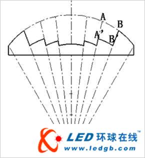 進(jìn)一步分析知道,由于LED光源是在光軸部分的發(fā)光強(qiáng)度大,邊緣部分小,而分厚度法得到的鋸齒恰恰是在中間部分比在邊緣部分有更大的齒距(見圖3),因此在光強(qiáng)度大的地方損失會(huì)少,即總體上可以有更少的光損失。