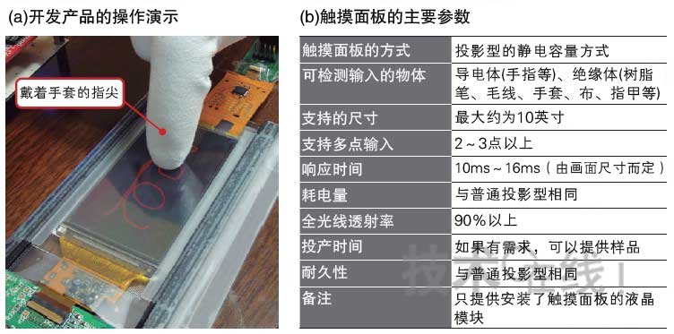 雖然日立顯示器公司沒有公開產品采用的技術細節,但是該公司稱,其產品在普通投影型觸摸面板上“添加了某種材料,改變了構造”。盡管添加了材料,但為了使安裝觸摸面板的液晶面板模塊厚度和大小不發生變化,該公司進行了多種努力。不僅改進了硬件,還新開發出了能夠檢測絕緣物的處理算法。