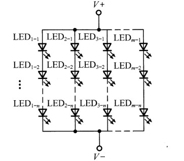 若干個LED先并后串的混聯形式如圖6所示。由于LED1-n~LEDm-n先并聯連接,提高了每組LED故障下的可靠性,但是由此一來每組并聯LED的均流問題就至關重要。為此,可以通過配對挑選,將工作電壓和電流盡量相同的LED作為并聯的一組,或者給每個LED串接小的均流電阻來解決。這種混聯形式具有的其他特點和存在的問題,與先串后并連接形式相類似。