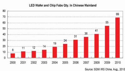 在中國LED產業結構不斷調整和優化的過程中,未來幾年,中國外延、芯片企業規模也將進一步擴大。到2010年8月,中國已有LED外延和芯片企業69家(包括20余家在建或計劃中)。在已經生產或在建的企業中,有48家涉及LED核心環節外延及芯片制造,有10余家專注于LED芯片制造。