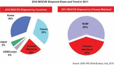 2010年全球MOCVD新增安裝量中,由于受到LED背光在LCD TV滲透的加快帶動下, LCD TV制造強國的韓國增量最多,其次是臺灣地區。根據SEMI統計,中國大陸今年MOCVD新增量大概在177臺,出貨量居全球第三。另外,根據SEMI統計和分析,結合MOCVD供應情況,2011年中國MOCVD新增量份額有望達到全球的40%,而其它地區的增量會保持與2010年相當的水平或下降。