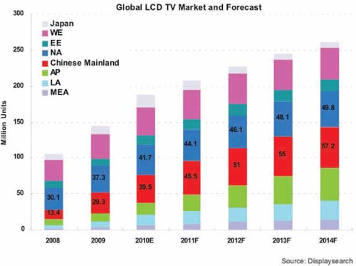 中國既是液晶電視的制造大國,同時也是消費大國,據預計,2011年之后中國將成為全球最大的液晶電視消費市場。此外,中國是世界最大的照明光源,如熒光節能燈、白熾燈等很多照明光源的制造基地和出口基地,2010年中國各類照明光源產量有望達到150億只以上。隨著LED在該類市場的滲透率不斷攀升,中國LED市場需求潛力驚人。