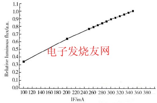 發光二極管在調節光通量方面具有一定的優勢,器件的光通量隨著電流增加而增加,在100mA~250mA,光通量增加率為126.2%;從250mA~350mA時,電流的增加輻度較小且呈非線性增加,增加率為30.4%。PN結是發光二極管的核心部分,電流增加后,注入到發光區的電子和空穴數量增加,發生輻射復合的數量也會增加,器件的光通量增加。但當注入電流繼續增加到某一值時,光通量輸出不再增加,趨于飽和。