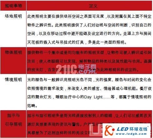 人類的照明需求大體包括四個方面:場地照明、物體照明、情境照明、指示與引導(dǎo)照明,而根據(jù)被照物的不同又分為平面光型、線光型、投光型與聚光型。此外,有時人們會需要光直接照射到物件或照明表面,被照物的照度、對比感較高,這稱為直接照射。有時又會需要光線先照射到一個表面后,再反射到需要被照亮的物件或表面,這稱為間接照明。此類光線通常比較柔和,漫射的范圍會比較廣。設(shè)計(jì)者需依不同的照明需求設(shè)計(jì)不同的產(chǎn)品。