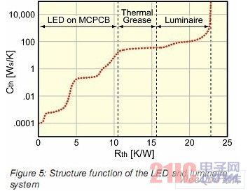 在圖5中,最初的曲線(xiàn)非常陡峭,同時(shí)熱容被加熱。這個(gè)曲線(xiàn)進(jìn)行了注解,描述了LED/MCPCB,封固劑(導(dǎo)熱硅脂)和照明設(shè)備三個(gè)階段。但在第一個(gè)階段內(nèi),曲線(xiàn)描述了更小的一些階段,譬如Dieattach,散熱板,甚至是緊固銅散熱板和MCPCB的膠水。注意這個(gè)圖形證實(shí)了早期的一個(gè)論點(diǎn),那就是LED自身的熱阻占整個(gè)系統(tǒng)結(jié)點(diǎn)至環(huán)境熱阻的50%。