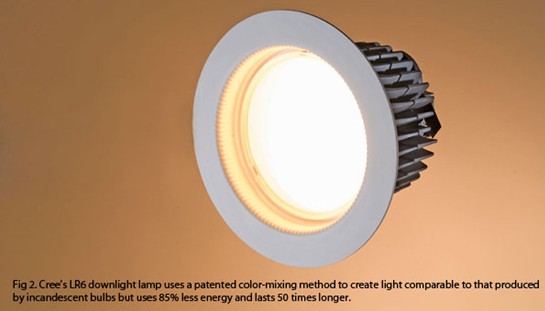 另外,LED輸出水平已經(jīng)達(dá)到150流明/瓦,而且還在繼續(xù)上升。幾家LED廠商生產(chǎn)的高亮度LED,可以提供顏色范圍較寬的照明。例如,Cree公司生產(chǎn)的LR6筒燈,采用了獲得專利的顏色混合方法,所發(fā)出的光可以媲美白熾燈,但功耗要比白熾燈減少85%,而壽命是它的50倍。
