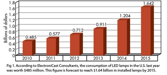 ElectroniCast Consultants最近公布的市場研究報告認(rèn)為,去年美國消費(fèi)的LED燈泡價值4.85億美元。該公司預(yù)測,以2015年該數(shù)字將達(dá)到16.4億美元。
