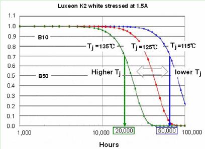 不同品牌LED的光衰是不同的,通常LED廠家會(huì)給出一套標(biāo)準(zhǔn)的光衰曲線。例如Philips Lumiled公司的Luxeon K2的光衰曲線如圖1所示,當(dāng)結(jié)溫從115℃提高到135℃,其壽命就會(huì)從50,000小時(shí)縮短到20,000小時(shí)。