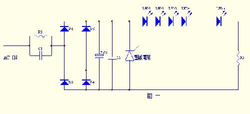 圖一為一個實際的采用電容降壓的LED驅(qū)動電路。請注意,大部分應(yīng)用電路中沒有連接壓敏電阻或瞬變電壓抑制晶體管,建議連接上,因壓敏電阻或瞬變電壓抑制晶體管能在電壓突變瞬間(如雷電、大用電設(shè)備起動等)有效地將突變電流泄放,從而保護二級關(guān)和其它晶體管,它們的響應(yīng)時間一般在微毫秒級。
