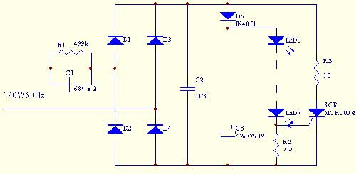在圖二電路中﹐可控硅SCR及R3組成保護電路﹐當流過LED的電流大于設(shè)定值時﹐SCR導通一定的角度﹐從而對電路電流進行分流﹐使LED工作于恒流狀態(tài)﹐從而避免LED因瞬間高壓而損壞。