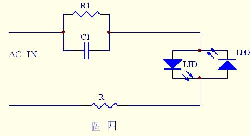 圖四是一個最簡單的電容降壓應(yīng)用電路﹐電路中利用兩只反并聯(lián)的LED對降壓后的交流電壓進行整流﹐可以廣泛應(yīng)用于夜光燈﹑按鈕指示燈﹐要求不高的位置指示燈等場合。