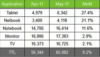 此外正規平板電腦用面板出貨表現依舊維持成長態勢,較前月成長27.4%,出貨量來到634萬片。上網本用面板受到二線白牌廠商采用,搭載在類平板電腦機產品上,也持續帶動5月份出貨總量來到411萬片,較4月增加了21.1%。