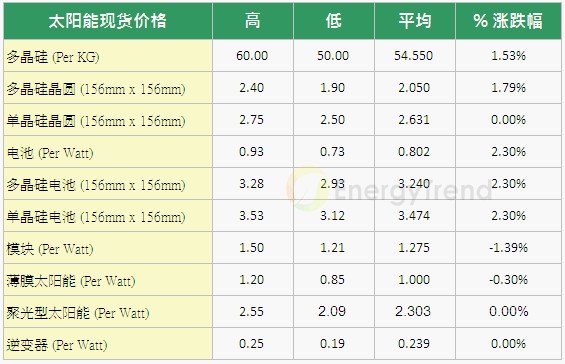 本周調查結果顯示,上游的多晶硅平均成交價來到$54.55/kg,漲幅為1.53%。在硅外延片方面,多晶硅外延片平均價格微幅上揚到$2.05/piece,漲幅為1.79%。而單晶硅外延片本週平均價格仍維持在$2.631/piece,與上周相同。另一方面,太陽能電池的需求受到市場需求轉向的影響,高效率產品的需求仍維持熱絡,售價也維持相對高檔;但在轉換效率偏低的產品方面,交易價格面臨較大的壓力,然而本周電池平均價格上漲到$0.802/Watt,漲幅為2.3%。而在模組市場方面,平均交易價格滑落到$1.275/Watt,跌幅為1.39%。另一方面,薄膜市場價格受到印度市場價格影響,出現微幅滑落,目前價位在$1.000/Watt,跌幅為0.3%。