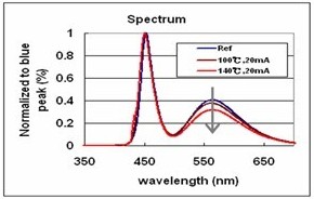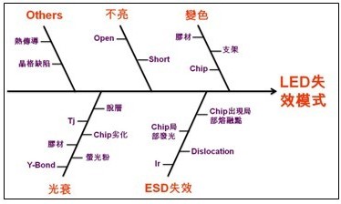 5. 其他:突然間的失效常常是因為熱應力所致,當環氧樹脂的封裝達到玻璃轉移溫度(Tg)時,樹脂會很快速的膨脹,在半導體和焊點接觸的位置產生機械應力來弱化或扯斷它,而在非常低的溫度時則會讓封裝產生裂痕。 此外,高功率LED對電流的擁擠敏感,不均勻的電流密度分布在接合點(junction)上,可能會產生局部的熱點,存在熱燒毀的風險,若再出現基板的熱傳不均勻,將使問題變得更嚴重,這常見于銲接材料的孔洞或是電子遷移效應和Kirkendall空洞,故熱燒毀亦是LED常見的失效模式。