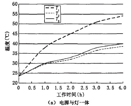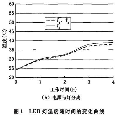 由于電源本身產生一定的熱量,使得LED燈上的熱量來源增加。同時,電源與燈一體設計使得LED燈整體受熱不均,這些因素都會導致燈具發生疲勞和早期失效,而影響其壽命。圖1為LED燈溫度隨工作時間的變化曲線,圖中T1為放置電源處溫度,T2為遠離電源處溫度,T3為燈體中心溫度。從圖中看出,隨著工作時間的增加,圖1(a)中T1遠大于T2和T3;圖1(b)中T1與T2兩曲線重合,T3略大于T1和T2。可見分離電源后,整燈的溫度分布很均勻。