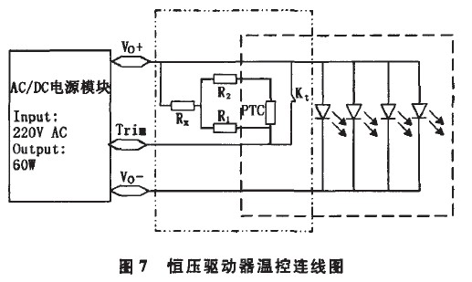 圖7為恒壓驅動器溫控的連線圖。Trim端用來調節電源的輸出。左側點線型虛線框中部分為控制電路,其中:PTC為正溫度系數溫敏電阻;R1、R2、R,均為普通電阻,與PTC溫敏電阻匹配調節驅動器輸出電壓;Kt為常閉型溫度繼電器,其斷開溫度為60℃,自動閉合溫度為48%。右側虛線框中部分為LED模塊部分。Kt和PTC安裝在LED模塊上,并與模塊緊密接觸。常溫下Kt處于閉合狀態,此時控制電路中控制驅動器額定輸出,該LED模組常溫工作額定總電壓為24V。當繼電器溫度上升到60℃時Kt