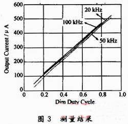 圖4為在PWM調光模式下外加PWM脈沖驅動信號和輸出驅動電流的測量結果。PWM占空比從0~100%。從圖中可以清楚的看到,通過改變不同的PWM占空比可以調節(jié)額定電流,PT4115最大能夠輸出1.2 A的電流。