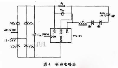 這里采用LED驅動芯片PT4115。PT4115是一款連續(xù)電感電流導通模式的降壓恒流源IC,能將直流電壓直接轉換成穩(wěn)定的恒流輸出。