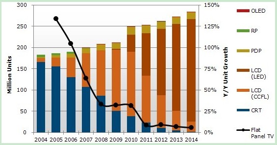 2004-2014年從技術類型預測全球電視出貨情況
