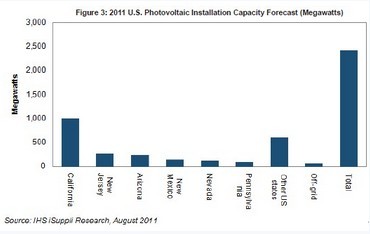 據(jù)IHS iSuppli公司的光伏市場研究報(bào)告,2011年美國光伏(PV)安裝容量將大增166%,總體安裝容量將達(dá)到2.4GW,加州將一馬當(dāng)先。