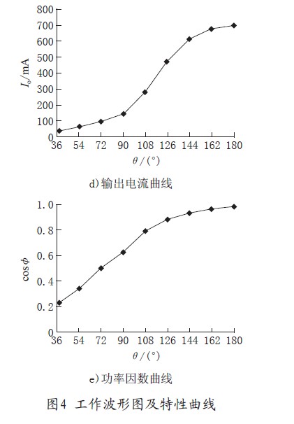 圖4d)為可控硅不同導(dǎo)通角對(duì)應(yīng)的輸出電流曲線,實(shí)際調(diào)試中可控硅導(dǎo)通角在150°之后就接近滿載輸出了。圖4e)為可控硅在不同導(dǎo)通角下對(duì)應(yīng)電路的cosφ曲線。