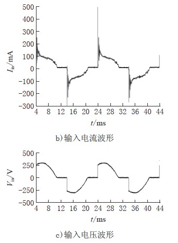 圖4a)、b)、c)為可控硅導(dǎo)通角為115°時(shí)阻抗匹配開關(guān)驅(qū)動(dòng)電壓VZ、輸入電流Iin、輸入電壓Vin的波形,電路的輸出電流為470mA,功率因數(shù)為0.78。從圖中可看出,當(dāng)可控硅導(dǎo)通瞬間,由于驅(qū)動(dòng)器輸入端有差模濾波電容導(dǎo)致輸入電流有沖擊電流尖峰,而當(dāng)輸入電流小于一定值時(shí),阻抗匹配開關(guān)開通以保證流過可控硅的電流大于其維持電流。