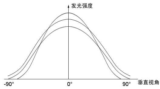 每個(gè)燈點(diǎn)在不同的角度觀看時(shí)亮度是不同的,且每個(gè)燈點(diǎn)隨著角度變化的光強(qiáng)分布曲線也不同。下圖為三顆LED燈點(diǎn)的發(fā)光強(qiáng)度隨垂直視角變化的示意圖線: