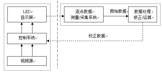 (圖一 注:圖中點(diǎn)劃線左側(cè)是顯示屏系統(tǒng),右側(cè)是逐點(diǎn)校正數(shù)據(jù)采集與運(yùn)算系統(tǒng)。)