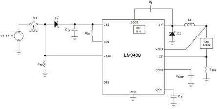 對于此應(yīng)用的調(diào)光和閃光部分,可以使用多種方法降低向LED陣列提供的功率。最常用的一種方法是脈寬調(diào)制調(diào)光,這種方法通常使用專門的邏輯信號高速開啟和關(guān)閉LED以控制總體光輸出。這種方法簡單有效,但可能極少用于汽車電子系統(tǒng)應(yīng)用,因為在線束中需要一根額外的線路用于調(diào)光信號。另一種方法稱為雙線調(diào)光,向LED驅(qū)動器提供的電源定期中斷以控制調(diào)光。1.5A整體式開關(guān)穩(wěn)壓器LM3406具有此功能,其真實電流平均值實現(xiàn)更嚴(yán)密的光輸出控制。集成的N通道MOSFET不提供控制器集成電路具有的靈活性,因此降低了板上的復(fù)雜性。圖8顯示了使用雙線調(diào)光方法的LM3406應(yīng)用示例。