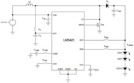 圖1使用LM3421的升壓穩(wěn)壓器驅(qū)動10個LED